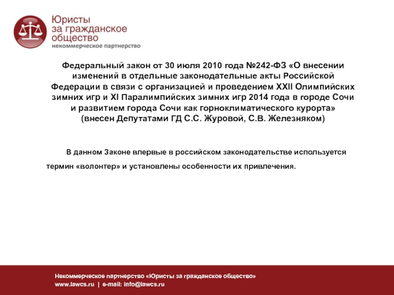 В данном Законе впервые в российском законодательстве используется термин «волонтер» и установлены особенности их привлечения.