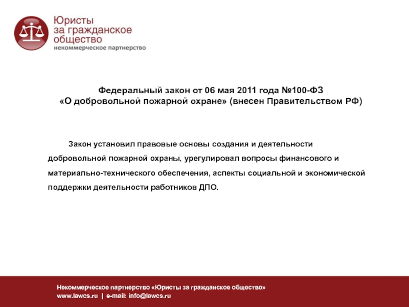 Закон установил правовые основы создания и деятельности добровольной пожарной охраны, урегулировал вопросы финансового и материально-технического обеспечения, аспекты социальной и экономической поддержки деятельности работников ДПО.