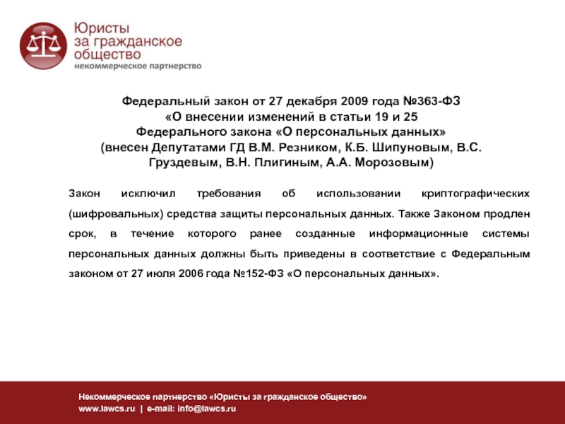 Закон исключил требования об использовании криптографических (шифровальных) средства защиты персональных данных. Также Законом продлен срок, в течение которого ранее созданные информационные системы персональных данных должны быть приведены в соответствие с Федеральным законом от 27 июля 2006 года №152-ФЗ «О персональных данных».