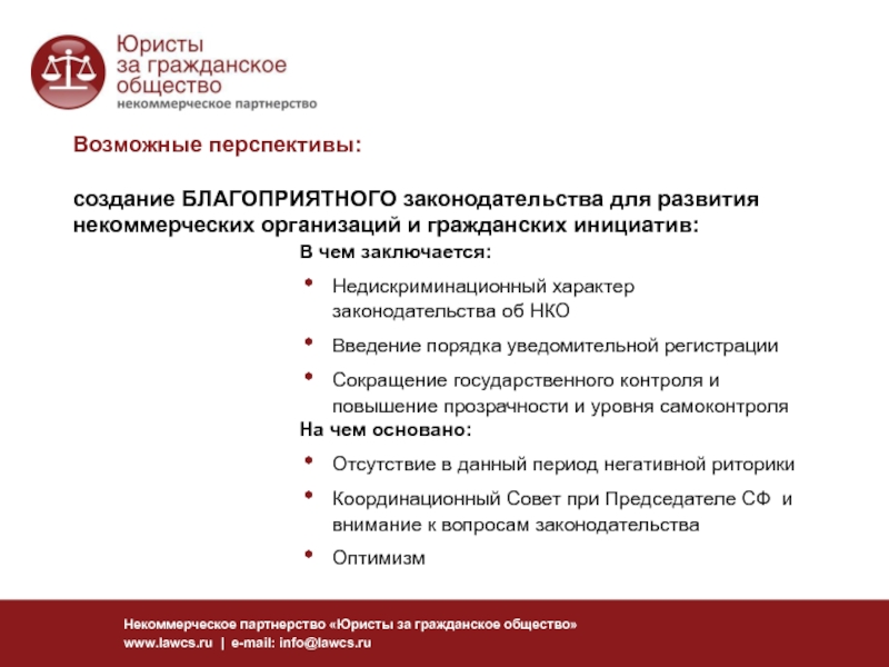 создание БЛАГОПРИЯТНОГО законодательства для развития некоммерческих организаций и гражданских инициатив: