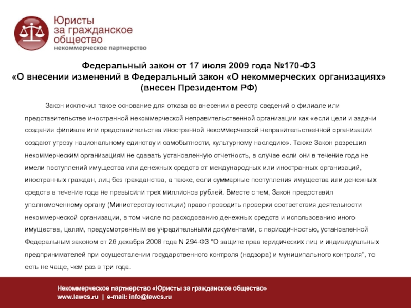 Закон исключил такое основание для отказа во внесении в реестр сведений о филиале или представительстве иностранной некоммерческой неправительственной организации как «если цели и задачи создания филиала или представительства иностранной некоммерческой неправительственной организации создают угрозу национальному единству и самобытности, культурному наследию». Также Закон разрешил некоммерческим организациям не сдавать установленную отчетность, в случае если они в течение года не имели поступлений имущества или денежных средств от международных или иностранных организаций, иностранных граждан, лиц без гражданства, а также, если суммарные поступления имущества или денежных средств в течение года не превысили трех миллионов рублей. Вместе с тем, Закон предоставил уполномоченному органу (Министерству юстиции) право проводить проверки соответствия деятельности некоммерческой организации, в том числе по расходованию денежных средств и использованию иного имущества, целям, предусмотренным ее учредительными документами, с периодичностью, установленной Федеральным законом от 26 декабря 2008 года N 294-ФЗ "О защите прав юридических лиц и индивидуальных предпринимателей при осуществлении государственного контроля (надзора) и муниципального контроля", то есть не чаще, чем раз в три года.