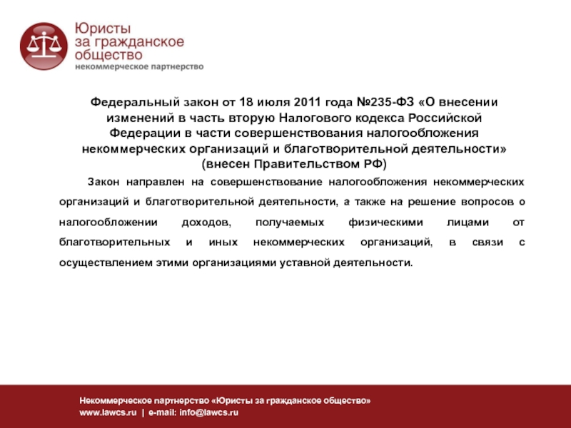 Закон направлен на совершенствование налогообложения некоммерческих организаций и благотворительной деятельности, а также на решение вопросов о налогообложении доходов, получаемых физическими лицами от благотворительных и иных некоммерческих организаций, в связи с осуществлением этими организациями уставной деятельности.