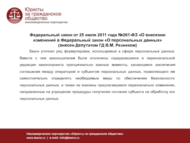 Закон уточнил ряд формулировок, используемых в сфере персональных данных. Вместе с тем законодателем были отклонены содержавшиеся в первоначальной редакции законопроекта принципиально важные моменты, касающиеся заключения соглашения между оператором и субъектом персональных данных, позволяющего им самостоятельно определять необходимые меры по обеспечению безопасности персональных данных, а также не внесены предлагавшиеся первоначально изменения, направленные на упрощение процедуры получения согласия субъекта на обработку его персональных данных.
