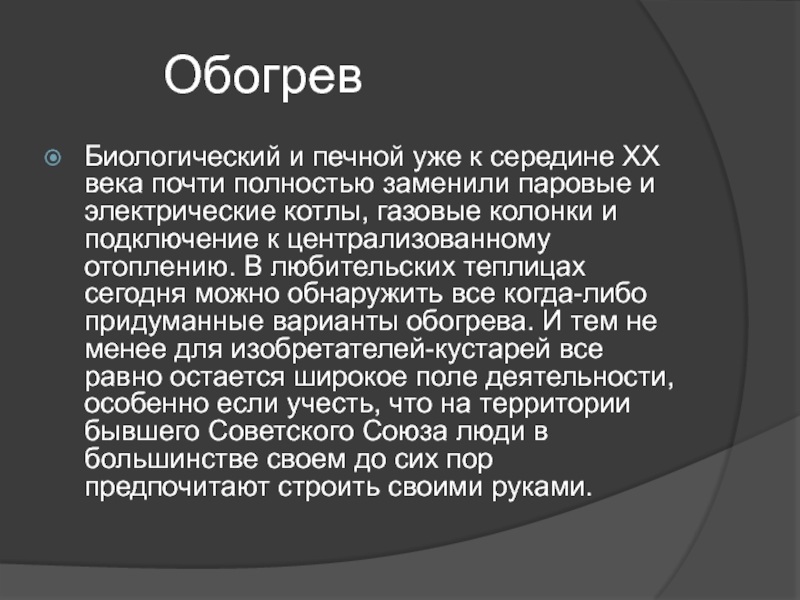 почти полностью заменили паровые и электрические котлы, газовые колонки и подключение к централизованному отоплению. В любительских теплицах сегодня можно обнаружить все когда-либо придуманные варианты обогрева. И тем не менее для изобретателей-кустарей все равно остается широкое поле деятельности, особенно если учесть, что на территории бывшего Советского Союза люди в большинстве своем до сих пор предпочитают строить своими руками.