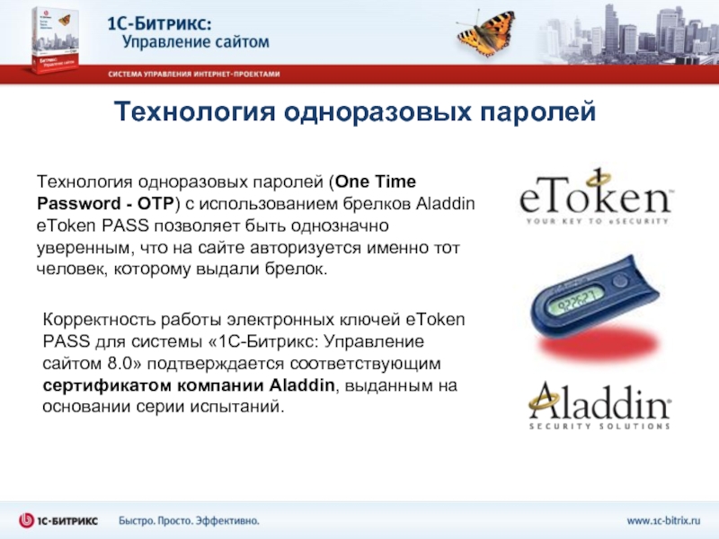 Корректность работы электронных ключей eToken PASS для системы «1С-Битрикс: Управление сайтом 8.0» подтверждается соответствующим сертификатом компании Aladdin, выданным на основании серии испытаний.