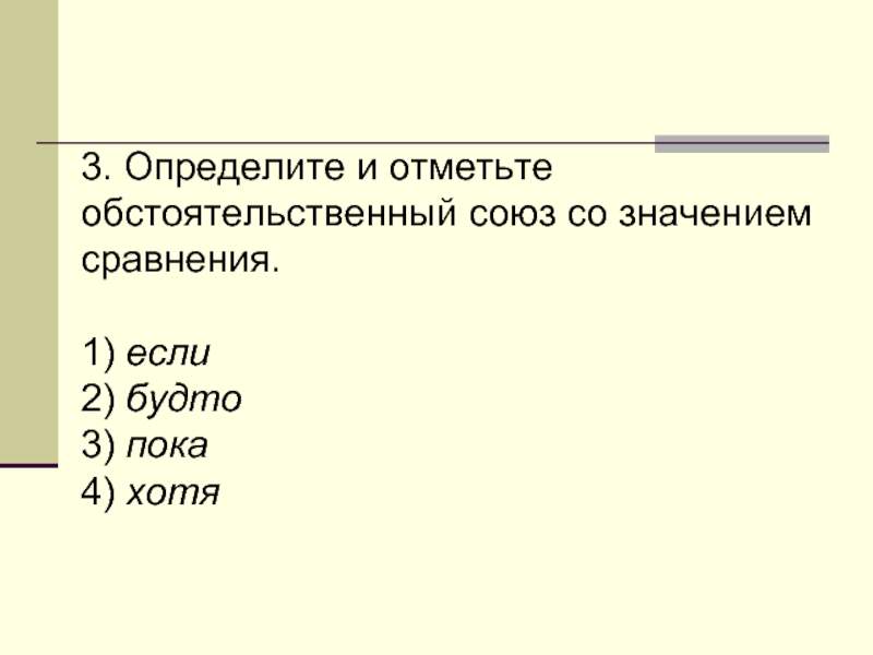 Слайд 173. Определите и отметьте обстоятельственный союз со значением сравнения.