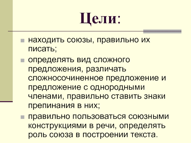 правильно пользоваться союзными конструкциями в речи, определять роль союза в построении текста.