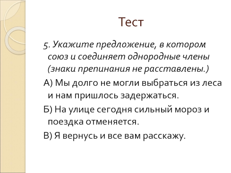 5. Укажите предложение, в котором союз и соединяет однородные члены (знаки