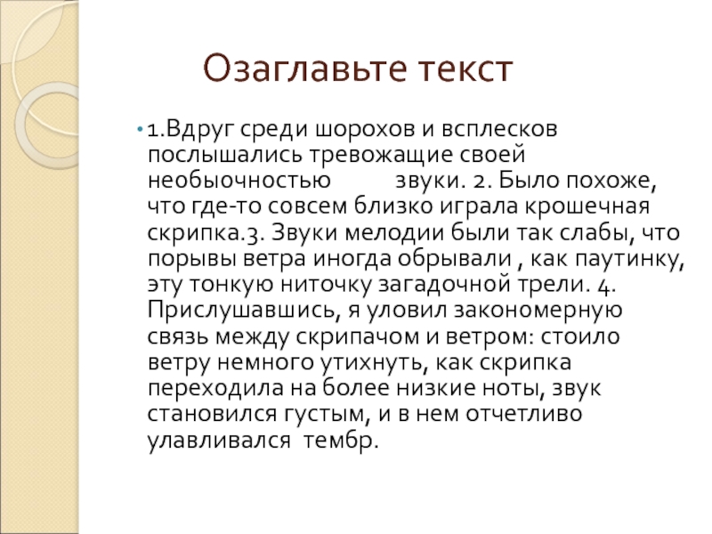 послышались тревожащие своей необыочностью звуки. 2. Было похоже, что где-то совсем близко играла крошечная скрипка.3. Звуки мелодии были так слабы, что порывы ветра иногда обрывали , как паутинку, эту тонкую ниточку загадочной трели. 4. Прислушавшись, я уловил закономерную связь между скрипачом и ветром: стоило ветру немного утихнуть, как скрипка переходила на более низкие ноты, звук становился густым, и в нем отчетливо улавливался тембр.