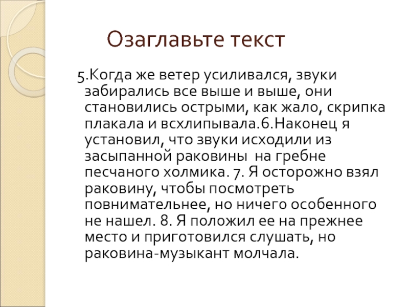 все выше и выше, они становились острыми, как жало, скрипка плакала и всхлипывала.6.Наконец я установил, что звуки исходили из засыпанной раковины на гребне песчаного холмика. 7. Я осторожно взял раковину, чтобы посмотреть повнимательнее, но ничего особенного не нашел. 8. Я положил ее на прежнее место и приготовился слушать, но раковина-музыкант молчала.