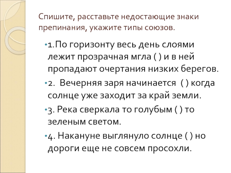 Слайд 8Спишите, расставьте недостающие знаки препинания, укажите типы союзов.