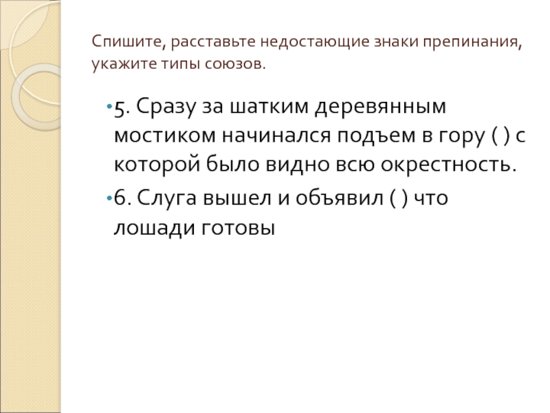 Слайд 7Спишите, расставьте недостающие знаки препинания, укажите типы союзов.