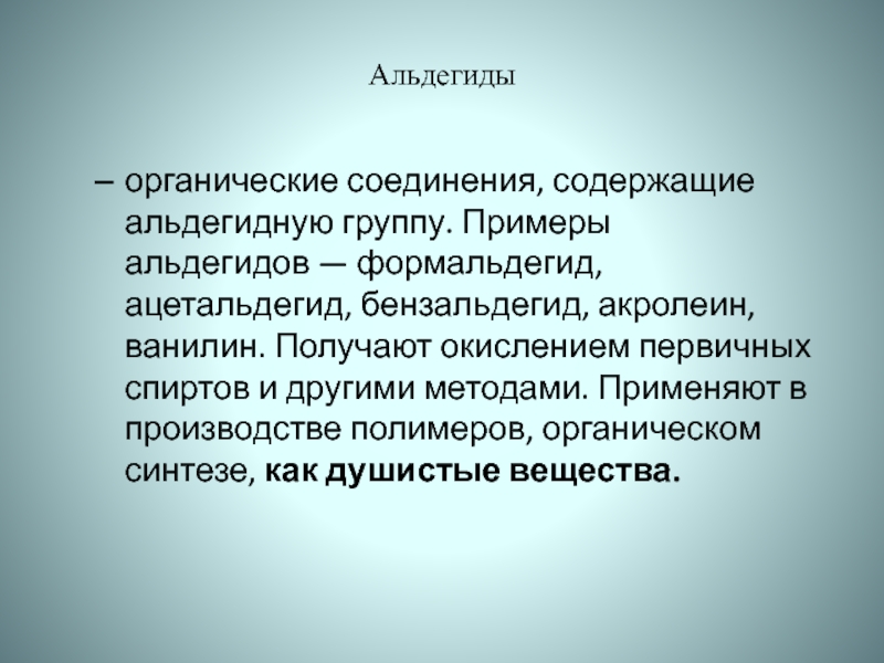 органические соединения, содержащие альдегидную группу. Примеры альдегидов — формальдегид, ацетальдегид, бензальдегид, акролеин,