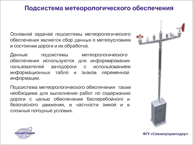 Подсистема метеорологического обеспечения также необходима для выполнения работ по содержанию дороги с целью обеспечения бесперебойного и безопасного движения, в частности зимой и в сложные погодные условия.