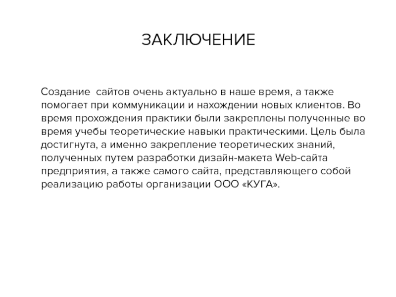 коммуникации и нахождении новых клиентов. Во время прохождения практики были закреплены полученные во время учебы теоретические навыки практическими. Цель была достигнута, а именно закрепление теоретических знаний, полученных путем разработки дизайн-макета Web-сайта предприятия, а также самого сайта, представляющего собой реализацию работы организации ООО «КУГА».