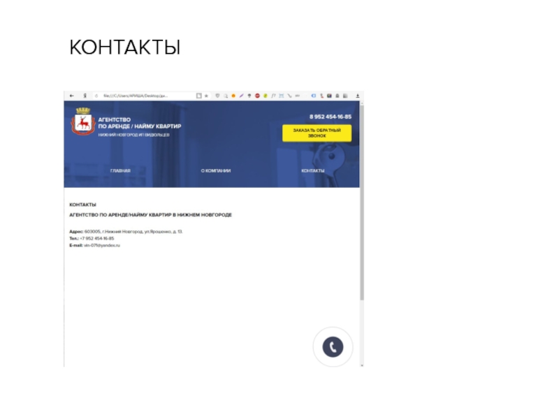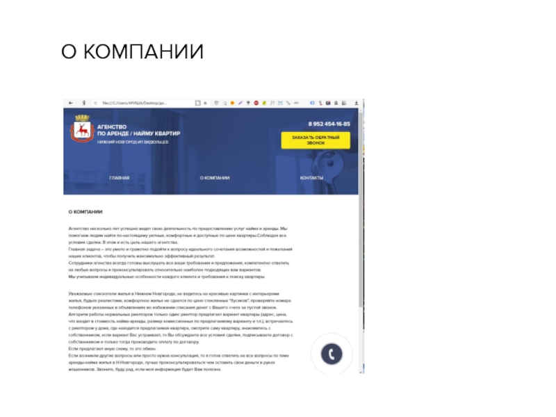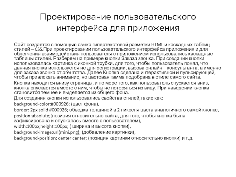 разметки HTML и каскадных таблиц стилей – CSS.При проектировании пользовательского интерфейса приложения и для облегчения взаимодействия пользователя с приложением использовались каскадные таблицы стилей. Разберем на примере кнопки Заказа звонка. При создании кнопки использовалась картинка с иконкой трубки, для того, чтобы пользователь понял, что данная кнопка используется не для регистрации, вызова онлайн – консультанта, а именно для заказа звонка от агентства. Далее Кнопка сделана интерактивной и пульсирующей, чтобы привлекать внимание, но цветовая гамма подобрана в стиле самого сайта.