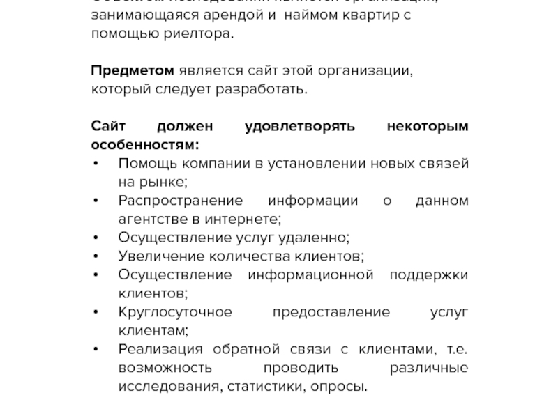 Слайд 3Объектом исследования является организация, занимающаяся арендой и наймом квартир с помощью
