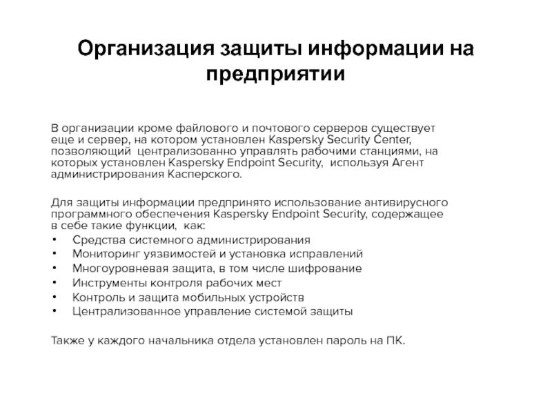 Для защиты информации предпринято использование антивирусного программного обеспечения Kaspersky Endpoint Security, содержащее в себе такие функции, как:
