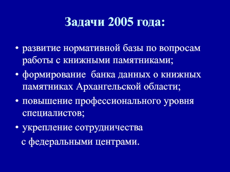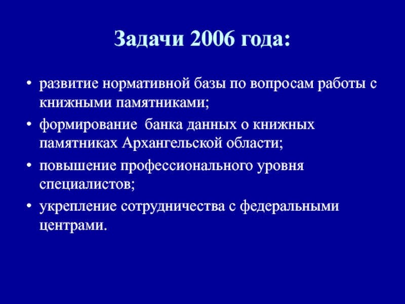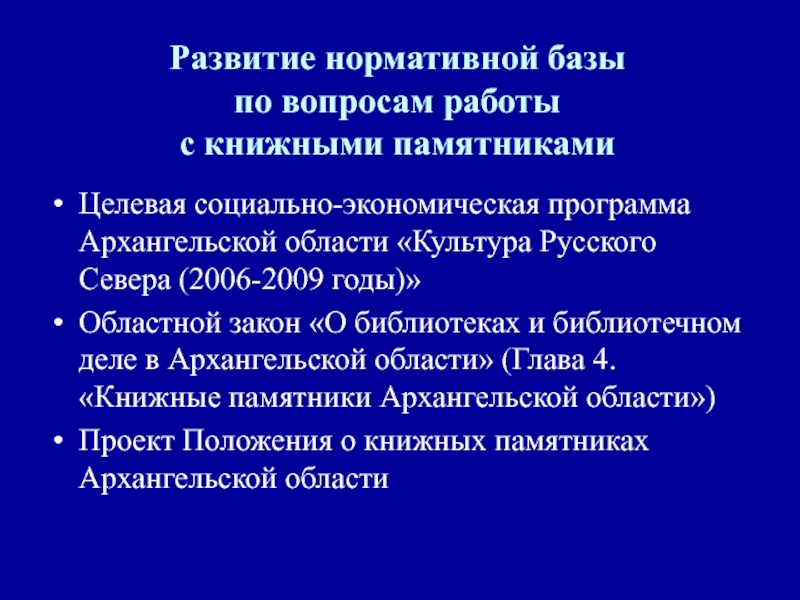 развитие нормативной базы по вопросам работы с книжными памятниками;