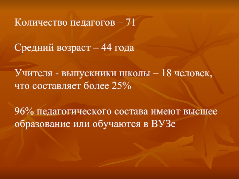 96% педагогического состава имеют высшее образование или обучаются в ВУЗе