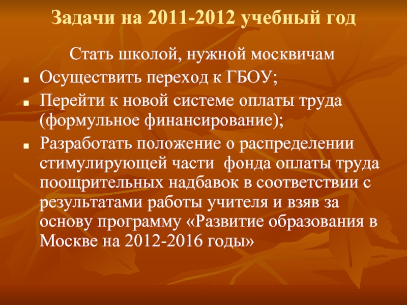 Разработать положение о распределении стимулирующей части фонда оплаты труда поощрительных надбавок в соответствии с результатами работы учителя и взяв за основу программу «Развитие образования в Москве на 2012-2016 годы»