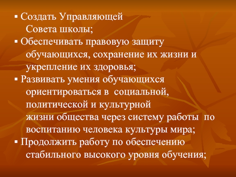 организации безопасного процесса получения качественного образования обучающимися на основе реализации их индивидуальных интересов и способностей с учетом образовательных потребностей социума и возможностей кадрового потенциала школы при обязательном сохранении и укреплении здоровья всех участников образовательного процесса