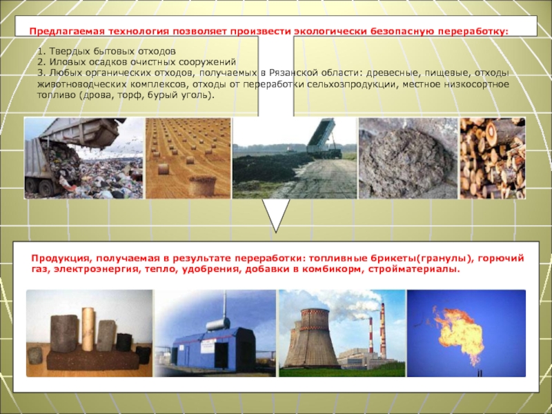 Топливные брикеты (гранулы), ген/газ, электроэнергию, тепло, удобрения, добавки в комбикорма, стройматериалы
