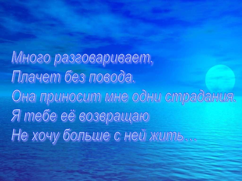Слайд 15Много разговаривает, Плачет без повода. Она приносит мне одни страдания. Я