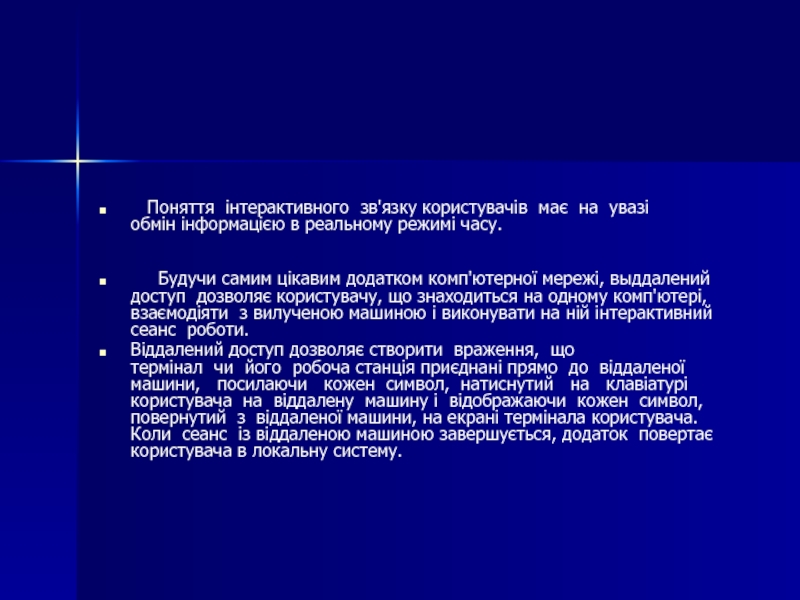Будучи самим цікавим додатком комп'ютерної мережі, выддалений доступ  дозволяє користувачу, що знаходиться на одному комп'ютері, взаємодіяти  з вилученою машиною і виконувати на ній інтерактивний сеанс  роботи.