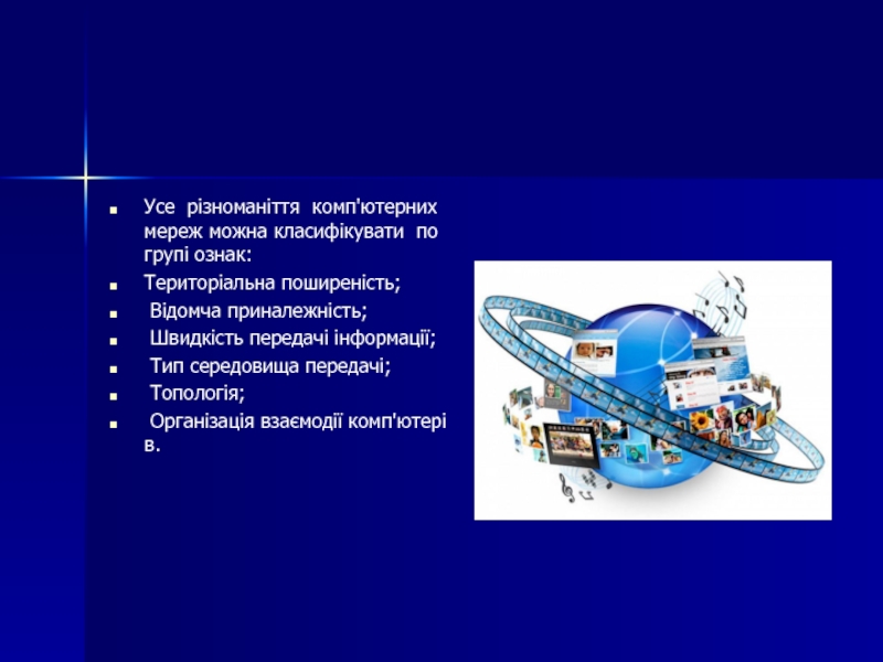 Усе  різноманіття  комп'ютерних мереж можна класифікувати  по групі ознак:
