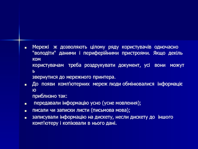 Мережі   ж  дозволяють  цілому  ряду  користувачів  одночасно "володіти"  даними  і  периферійними  пристроями.  Якщо  декільком користувачам   треба  роздрукувати  документ,  усі   вони   можуть звернутися до мережного принтера.
