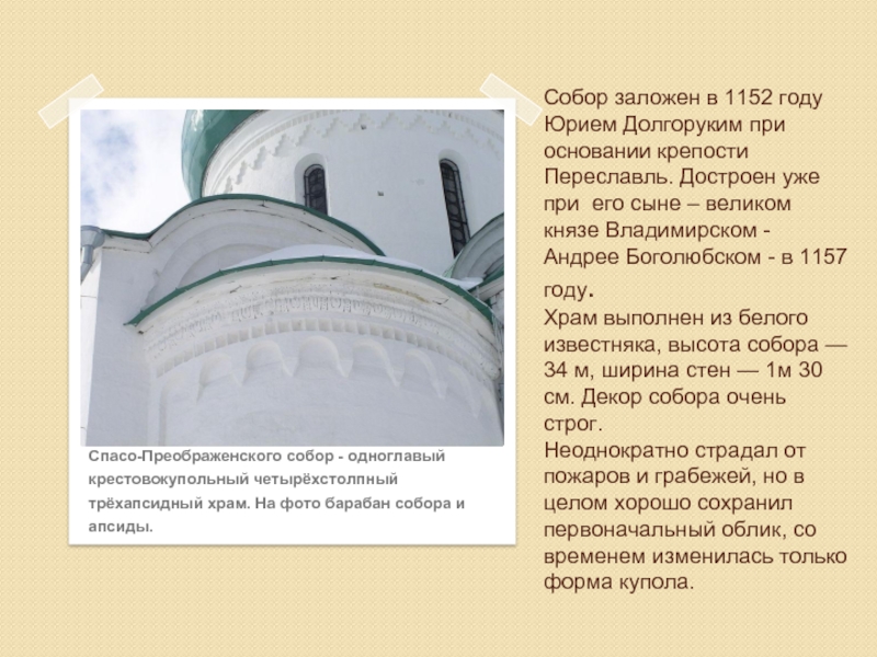 Спасо-Преображенского собор - одноглавый крестовокупольный четырёхстолпный трёхапсидный храм. На фото барабан собора и апсиды.