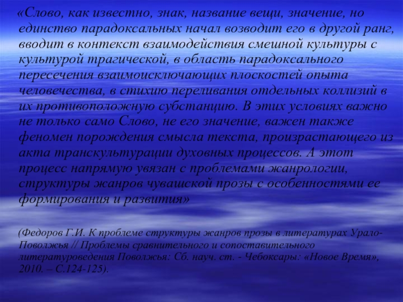 единство парадоксальных начал возводит его в другой ранг, вводит в контекст взаимодействия смешной культуры с культурой трагической, в область парадоксального пересечения взаимоисключающих плоскостей опыта человечества, в стихию переливания отдельных коллизий в их противоположную субстанцию. В этих условиях важно не только само Слово, не его значение, важен также феномен порождения смысла текста, произрастающего из акта транскультурации духовных процессов. А этот процесс напрямую увязан с проблемами жанрологии, структуры жанров чувашской прозы с особенностями ее формирования и развития»