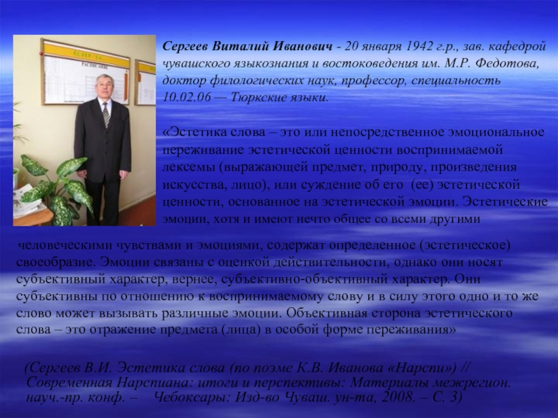 Сергеев Виталий Иванович - 20 января 1942 г.р., зав. кафедрой чувашского языкознания и востоковедения им. М.Р. Федотова, доктор филологических наук, профессор, специальность 10.02.06 — Тюркские языки.