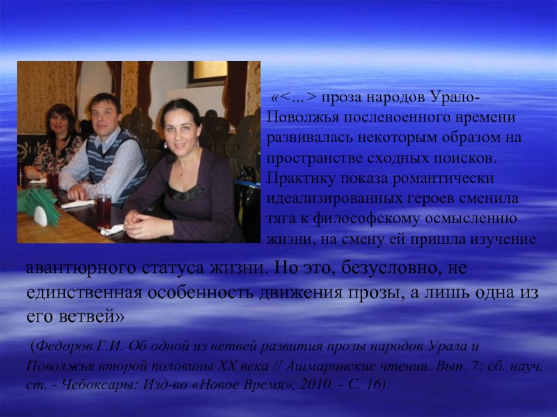 «<…> проза народов Урало-Поволжья послевоенного времени развивалась некоторым образом на пространстве сходных поисков. Практику показа романтически идеализированных героев сменила тяга к философскому осмыслению жизни, на смену ей пришла изучение