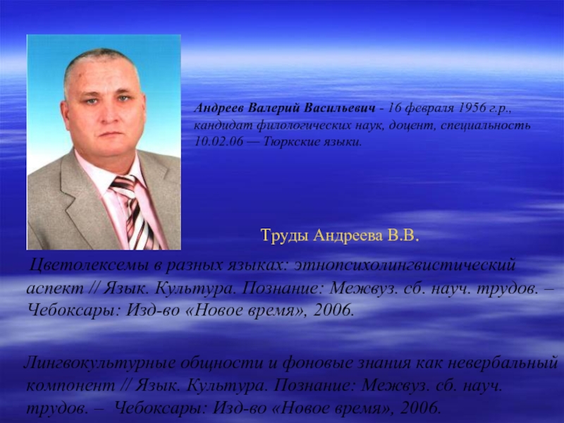 Андреев Валерий Васильевич - 16 февраля 1956 г.р., кандидат филологических наук, доцент, специальность 10.02.06 — Тюркские языки.