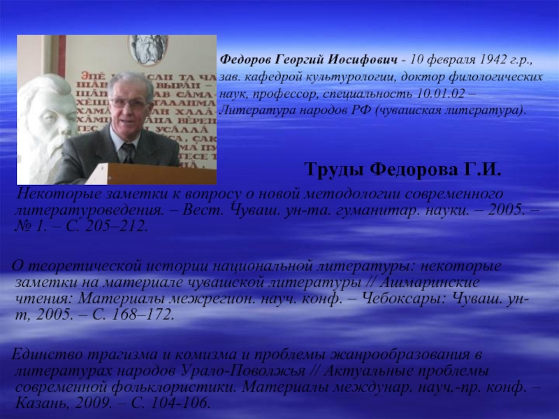 Федоров Георгий Иосифович - 10 февраля 1942 г.р., зав. кафедрой культурологии, доктор филологических наук, профессор, специальность 10.01.02 – Литература народов РФ (чувашская литература).