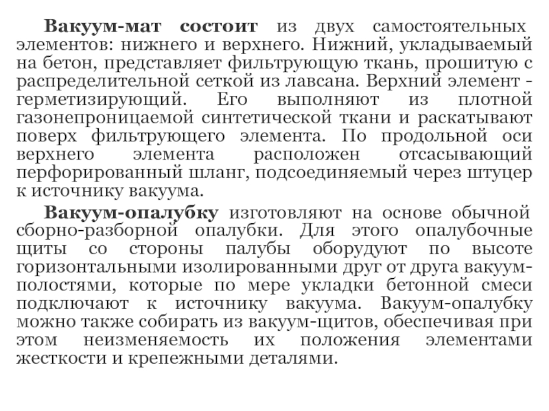 Вакуумирование бетона является технологическим методом, позволяющим извлечь из уложенной бетонной смеси около 10... 25% воды затворения с сопутствующим или дополнительнымуплотнением. Метод дает возможность применять бетонные смеси с по движностью до 10 см, что упрощает и удешевляет их распределение и уплотнение, достигая при этом существенного улучшения физико-механических характеристик затвердевшего бетона, соответствующих пониженному остаточному водоцементному отношению.