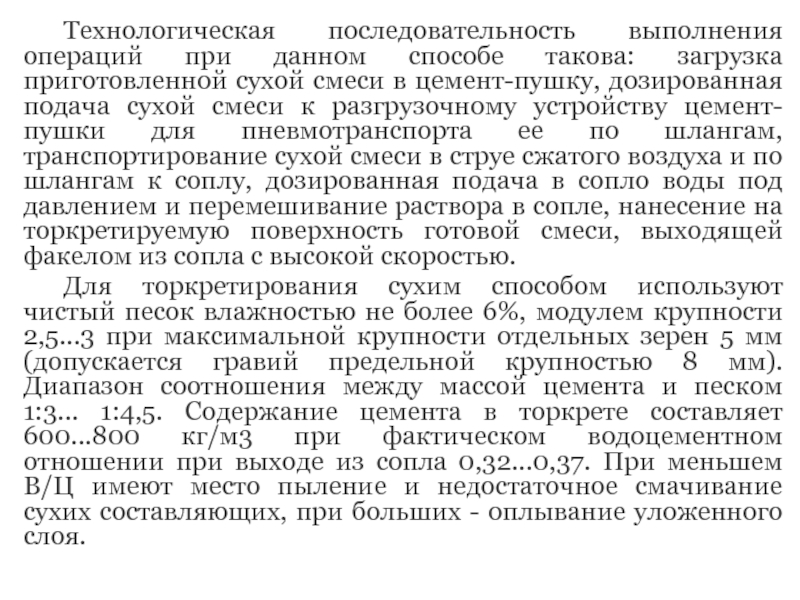 Для торкретирования сухим способом используют чистый песок влажностью не более 6%, модулем крупности 2,5...3 при максимальной крупности отдельных зерен 5 мм (допускается гравий предельной крупностью 8 мм). Диапазон соотношения между массой цемента и песком 1:3... 1:4,5. Содержание цемента в торкрете составляет 600...800 кг/м3 при фактическом водоцементном отношении при выходе из сопла 0,32...0,37. При меньшем В/Ц имеют место пыление и недостаточное смачивание сухих составляющих, при больших - оплывание уложенного слоя.