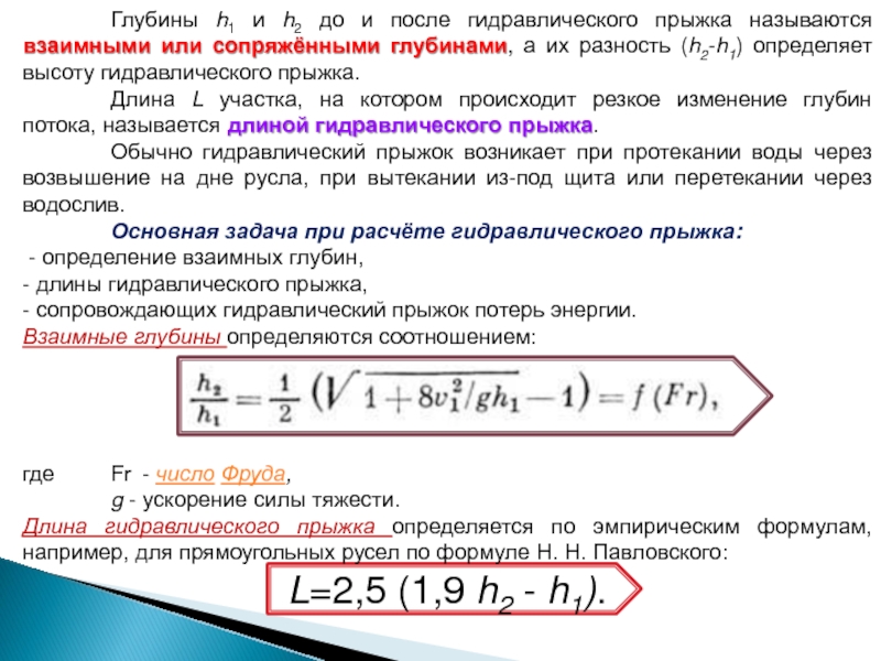 где: h1, h2 – первая и вторая сопряженные глубины прыжка;