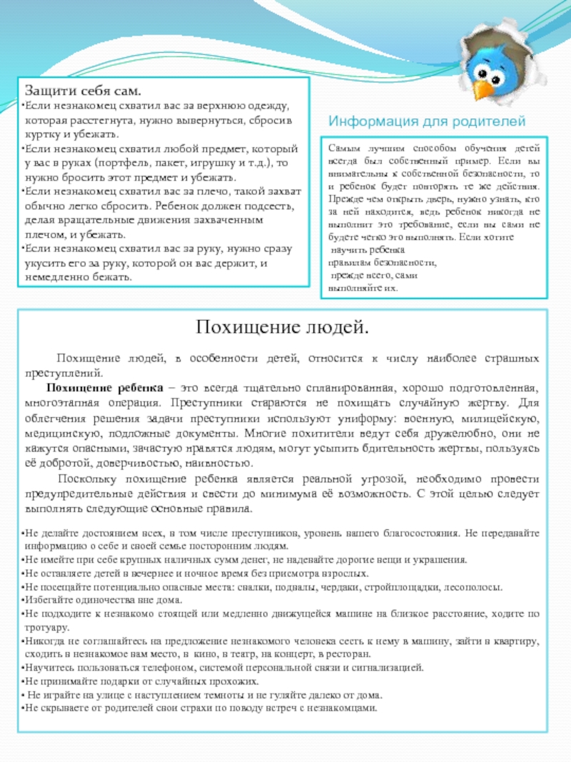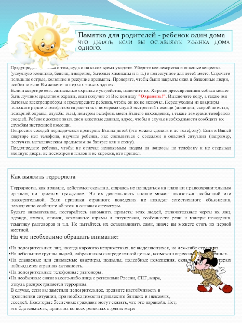 Наряду с организованной борьбой против терроризма каждый ребенок должен знать и выполнять следующие правила предупреждения и поведения в случае угрозы или возникновения террористического акта.