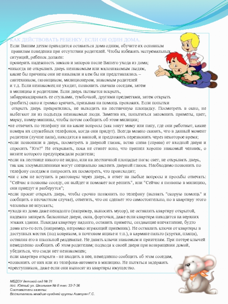 Постоянно проявляйте бдительность, держите окружающую обстановку под контролем. В случае возникновения подозрительной ситуации: неадекватное поведение отдельных граждан, подозрительный предмет, прямая угроза – незамедлительно сообщите об этом родителям, воспитателям, сотрудникам правоохранительным органов.