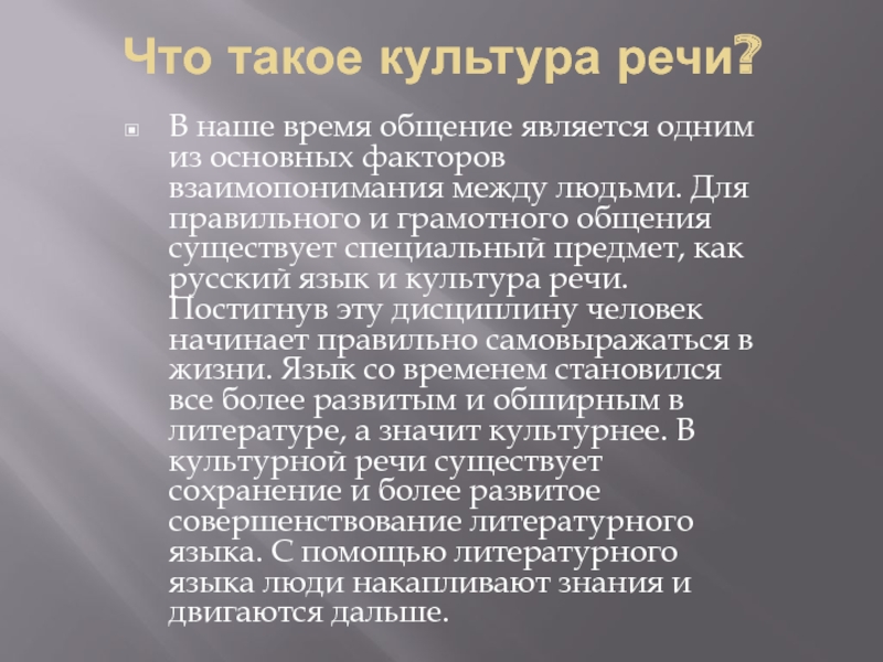 факторов взаимопонимания между людьми. Для правильного и грамотного общения существует специальный предмет, как русский язык и культура речи. Постигнув эту дисциплину человек начинает правильно самовыражаться в жизни. Язык со временем становился все более развитым и обширным в литературе, а значит культурнее. В культурной речи существует сохранение и более развитое совершенствование литературного языка. С помощью литературного языка люди накапливают знания и двигаются дальше.