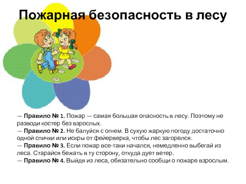 — Правило № 2. Не балуйся с огнем. В сухую жаркую погоду достаточно одной спички или искры от фейерверка, чтобы лес загорелся.
