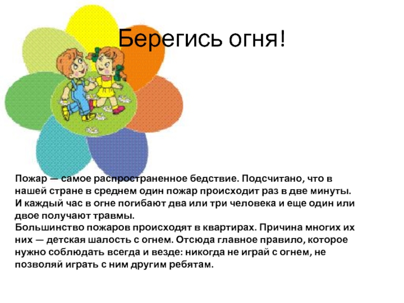 Большинство пожаров происходят в квартирах. Причина многих их них — детская шалость с огнем. Отсюда главное правило, которое нужно соблюдать всегда и везде: никогда не играй с огнем, не позволяй играть с ним другим ребятам.