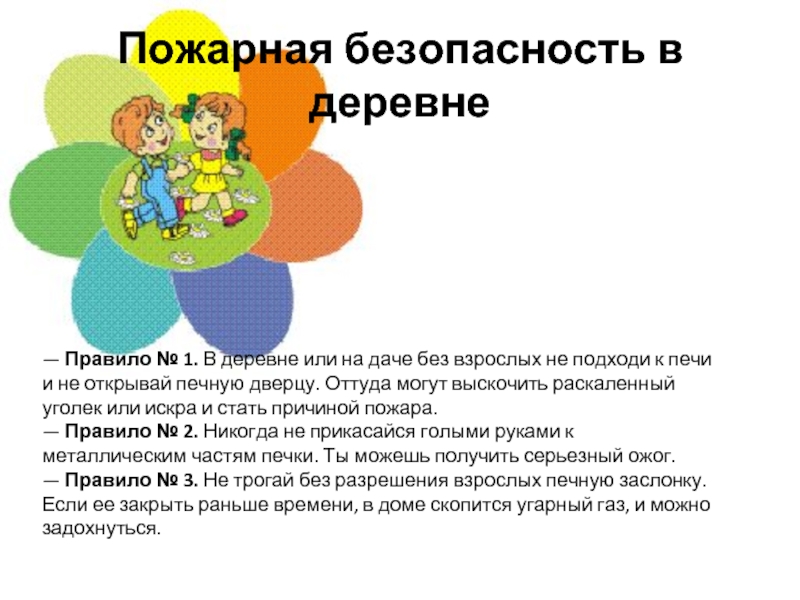 — Правило № 3. Не трогай без разрешения взрослых печную заслонку. Если ее закрыть раньше времени, в доме скопится угарный газ, и можно задохнуться.
