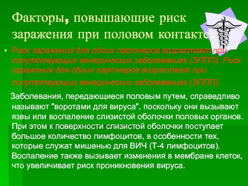 Слайд 9Факторы, повышающие риск заражения при половом контакте.
