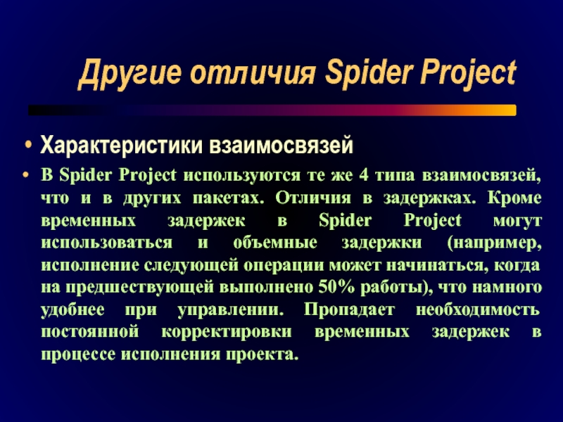 типа взаимосвязей, что и в других пакетах. Отличия в задержках. Кроме временных задержек в Spider Project могут использоваться и объемные задержки (например, исполнение следующей операции может начинаться, когда на предшествующей выполнено 50% работы), что намного удобнее при управлении. Пропадает необходимость постоянной корректировки временных задержек в процессе исполнения проекта.