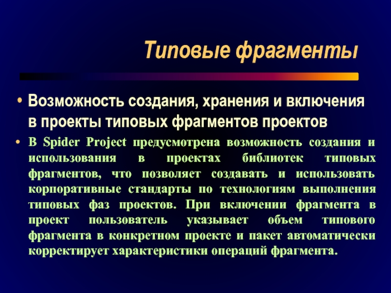 Spider Project предусмотрена возможность создания и использования в проектах библиотек типовых фрагментов, что позволяет создавать и использовать корпоративные стандарты по технологиям выполнения типовых фаз проектов. При включении фрагмента в проект пользователь указывает объем типового фрагмента в конкретном проекте и пакет автоматически корректирует характеристики операций фрагмента.