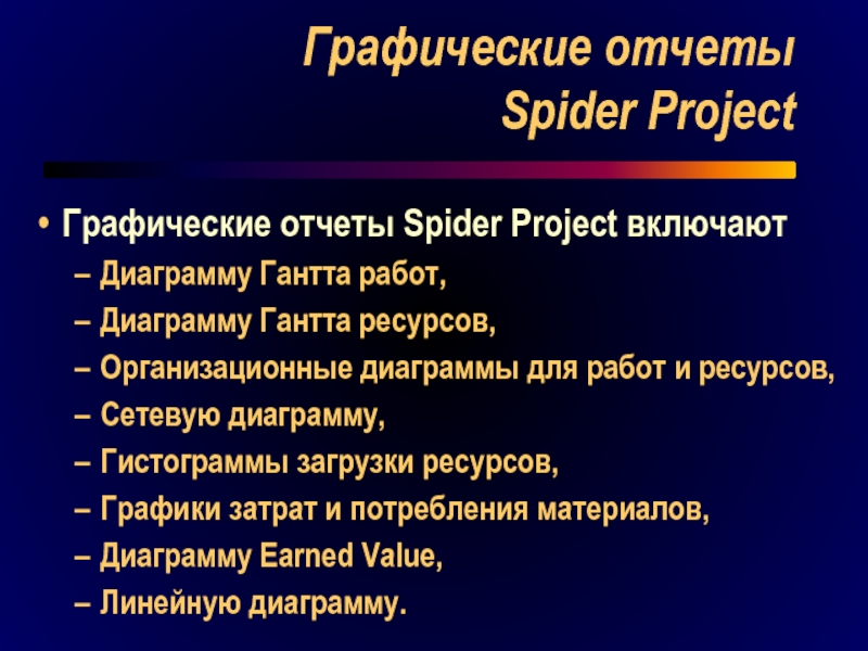 Analysis), встроенный в Spider Project, позволяет не только определить текущие значения параметров Earned Value, как в других пакетах, но и дает их историю и прогноз. Кроме того, в Spider Project можно проводить Earned Value Analysis не только суммарных затрат, но и других параметров проекта (компонент затрат, материалов). Это позволяет более гибко анализировать исполнение проекта и использовать Earned Value Analysis даже тогда, когда стоимостные параметры проекта неизвестны.